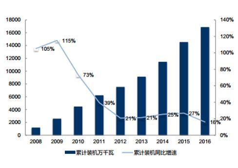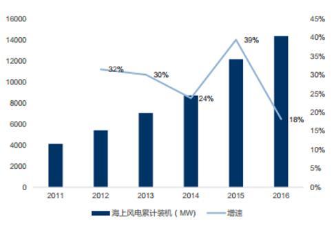 相比之下, 海上風(fēng)電增長增速高于陸上風(fēng)電,成為未來風(fēng)電行業(yè)重要的增量。 事實(shí)上,伴隨著陸上風(fēng)電可開發(fā)的區(qū)域逐漸減少,而海上風(fēng)電資源豐富,且沿海地區(qū)經(jīng)濟(jì)發(fā)達(dá),電網(wǎng)容量更大,風(fēng)電接入條件更好,近年來風(fēng)電行業(yè)逐漸由陸上向近海發(fā)展。 2001 年-2015年全球海上風(fēng)電累計(jì)裝機(jī)容量復(fù)合增長率 43.51%,2015年累計(jì)裝機(jī)容量 12167MW。2016 年全球海上風(fēng)電市場(chǎng)新增裝機(jī)容量 2217MW,同比下滑 36%。 截止 2016 年底,全球海上風(fēng)電累計(jì)裝機(jī)容量達(dá)到 14384MW。