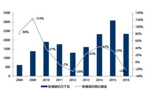 中國可再生能源學(xué)會(huì)風(fēng)能專業(yè)委員會(huì)公布的《2016 中國風(fēng)電裝機(jī)容量統(tǒng)計(jì)》結(jié)果顯示,2016 年中國(除臺(tái)灣地區(qū)外)風(fēng)電新增裝機(jī)容量為 2337 萬千瓦,同比下降 24%;累計(jì)裝機(jī)容量達(dá) 1.69 億千瓦。