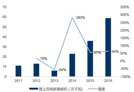 值得注意的是,與陸上風(fēng)電裝機(jī)下行相反,2016 年中國的海上風(fēng)電裝機(jī)則增長了六成。2016 中國海上風(fēng)電新增裝機(jī) 154 臺(tái),容量達(dá)到 59 萬千瓦,同比增長 64%。