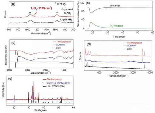 (a)液氨中合成LiO2的現(xiàn)場拉曼光譜數(shù)據(jù)(b)液氨中合成的LiO2在放置一段時(shí)間后產(chǎn)生N2的質(zhì)譜數(shù)據(jù)(c-e)液氨中LiO2最終轉(zhuǎn)變?yōu)長iOH和LiOH?H2O紅外光譜,拉曼光譜和x-射線研究結(jié)果。