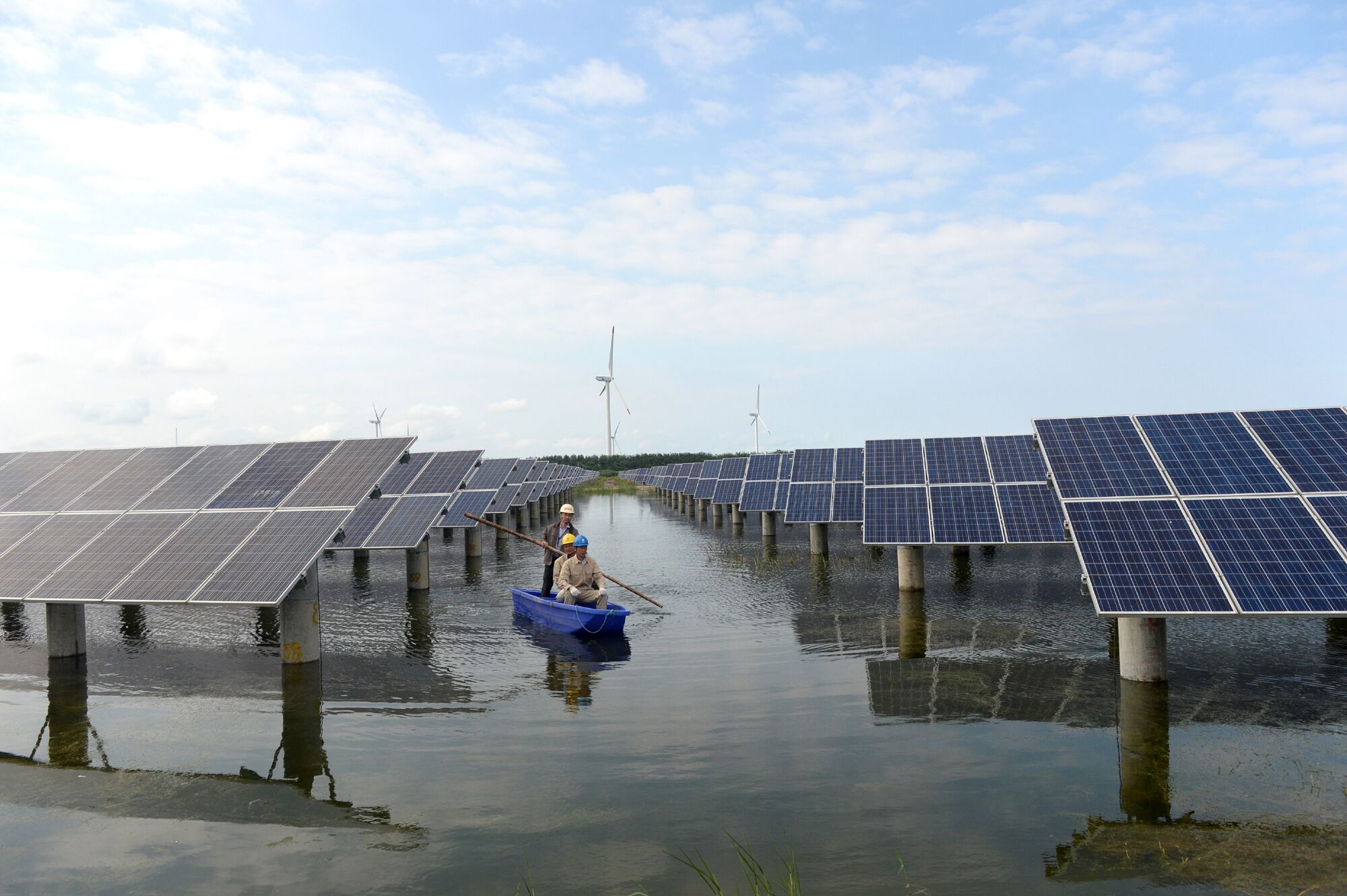 9月10日,國網(wǎng)海安供電員工乘船巡檢江蘇海東光伏35兆瓦漁光互補(bǔ)項目。