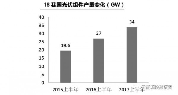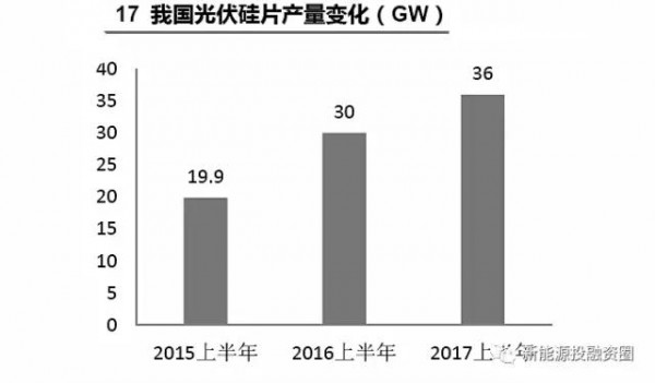 2017 上半年,國內多晶硅產量為11.5 萬噸,同比增長21.1%,行業(yè)產能利用率超過90%;國內硅片產量超36GW,同比增長超20%,行業(yè)產能利用率在80%以上;電池產量約為32GW,同比增長約28%,產能利用率80%以上,行業(yè)毛利率在10%以上;組件產量約為34GW,同比增長25.9%;二季度產能利用率在85%以上,行業(yè)毛利率在10%以上。上半年,光伏產業(yè)鏈無論是產量還是產能利用率都處于同期高位,略超市場預期。我國光伏硅片產量變化及我國光伏組件產量變化見下圖。