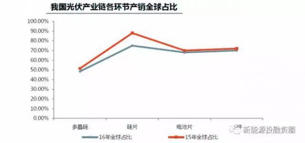 未來三年,光伏組件降成本將成為光伏系統(tǒng)成本降低的最主要貢獻力。光伏組件占系統(tǒng)成本的45%左右,BOS(系統(tǒng)平衡)成本占系統(tǒng)成本的40%左右。BOS 成本下降空間有限,涉及產品勞動等(如線纜,電氣設備等)價格相對剛性,不具備大幅下降的條件。降低系統(tǒng)成本的重任落在光伏組件,光伏組件可以通過提高工藝水平降低生產成本,還可以通過技術進步提高電池轉換效率,從而攤薄單位費用?!豆夥a業(yè)路線規(guī)劃圖》指出,至2020 年光伏組件價格仍有超40%的下降空間,將成為光伏系統(tǒng)成本降低的最主要貢獻力。我國光伏產業(yè)鏈各環(huán)節(jié)產銷全球占比見下圖。
