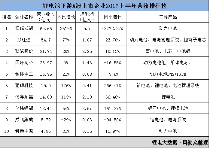 另外,上半年?duì)I業(yè)收入位列第二的欣旺達(dá),2017年上半年手機(jī)用電池銷售大幅增長,實(shí)現(xiàn)營收38.96億,同比增長69.15%。