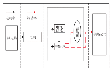 利用棄風電量進行電供熱是解決“三北”地區(qū)風問題的有效手段。夜間負荷低谷時段,利用谷電電或者協(xié)定的棄風電價對蓄熱式電鍋爐加熱,一方面向熱管網提供熱負荷,另一方面將多余熱能儲存至蓄罐中,以滿足次日電價高峰期的熱負荷要求。然而電爐的功率調節(jié)系統(tǒng)受機械部件制約,調節(jié)速率與風功快速波動不匹配,無法實現(xiàn)最大限度的消納風電。電學儲能具有電能雙向流動,有功、無功的靈活調節(jié)等點,其協(xié)調電鍋爐能夠改善其調節(jié)靈活性,具備跟蹤風功率的能力,提高風電供熱的經濟性。