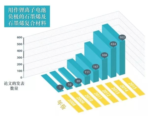 圖3 從2008年到2015年間發(fā)表的關(guān)于石墨烯及石墨烯復(fù)合材料的論文數(shù)。數(shù)據(jù)來源于斯高帕斯數(shù)據(jù)庫(Scopus,當(dāng)今世界最大的文摘與引文數(shù)據(jù)庫)中的關(guān)鍵詞搜索:“graphene lithium”、“graphene li-ion”、“graphene lithium-ion”和“graphene anode”。數(shù)據(jù)統(tǒng)計中搜羅的文獻類型為“文章”和“新聞文摘”,所有的結(jié)果都是被單獨挑選出來的。在上述數(shù)據(jù)中,需要指出的是,與理論或者計算方法相關(guān)的文章并沒有被包括在內(nèi)。最新的更新截止于2016年的1月31日。
