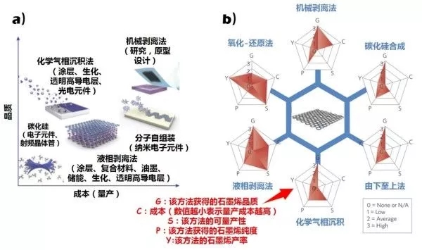圖4 幾種常見的石墨烯制備方法的比較:晶體品質(zhì)VS量產(chǎn)成本(a)和五種常用評價指標(biāo)的雷達(dá)圖(b)