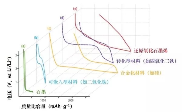 圖5 幾種典型鋰離子電池負極材料的電位曲線對比:a)鋰嵌入石墨、b)鋰嵌入高電壓氧化物(比如二氧化鈦TiO2)、c)可以與鋰進行合金化的材料(如硅Si)、d)會與鋰進行轉(zhuǎn)化反應(yīng)的材料(比如四氧化三鐵Fe3O4)以及d)還原氧化石墨烯中的儲鋰