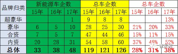 上表是按照品牌銷售的廠家口徑的數(shù)量,與合格證的廠家生產(chǎn)法人的口徑相對簡化,但權威的仍是法人單位的統(tǒng)計角度。對18年實施雙積分的最初的預期是企業(yè)能迅速推動插電混動和純電動的均衡發(fā)展,合資企業(yè)能夠推出新能源車。世界新能源車的隨著油價下跌的需求不旺,發(fā)展新能源車的熱情不高,新品推出不強。而合資企業(yè)的新能源車缺乏研發(fā)能力,外方導入需要一定時間,進度相對較慢。因此17年的合資企業(yè)推出新能源車的有7家占比15%,內資企業(yè)推出新能源車的有31家,占52%。