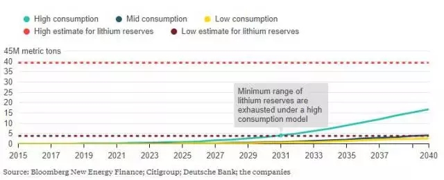 下圖來(lái)自彭博社金融的信息,是花旗銀行和德意志銀行等公司根據(jù)對(duì)鋰消費(fèi)程度的不同,對(duì)鋰礦資源在何時(shí)會(huì)枯竭的預(yù)測(cè)。