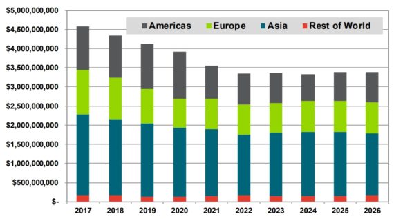 2017年,風(fēng)機(jī)材料市場(chǎng)的估計(jì)值為45.7億美元。其中,亞洲市場(chǎng)代表著風(fēng)機(jī)葉片材料的最大區(qū)域需求,預(yù)計(jì)2017年的市場(chǎng)規(guī)模為21.2億美元,其次是歐洲11.6億美元,緊隨其后的是美洲11.3億美元??紤]到全球風(fēng)能市場(chǎng)的規(guī)模大且日趨成熟的性質(zhì),在未來十年風(fēng)機(jī)葉片材料的增長(zhǎng)率并不是太大,在大多數(shù)市場(chǎng)上已經(jīng)達(dá)到頂峰并趨于平穩(wěn)。