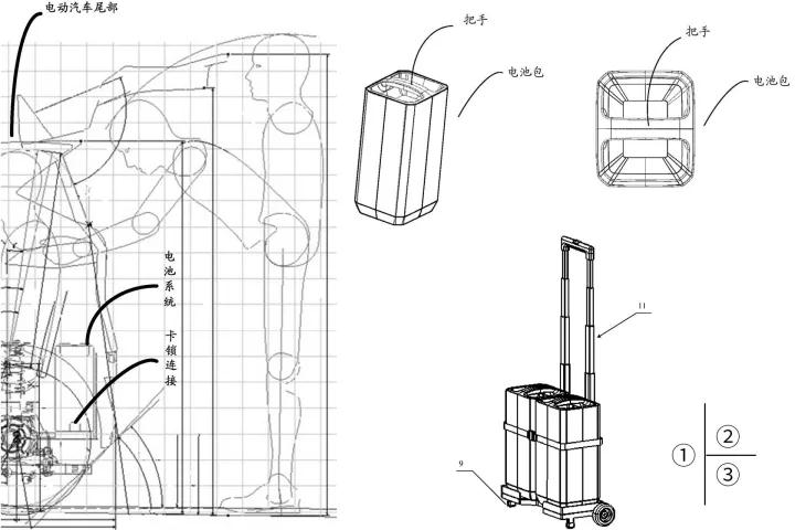 ① 電池組位置;② 電池組結(jié)構(gòu);③ 用于攜帶電池的“小拖車”