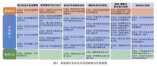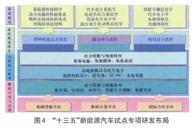 1)研發(fā)布局。“十三五”新能源汽車試點專項總體布局,按照全創(chuàng)新鏈設計原則分為 4 個層次:基礎科學問題、共性核 心技術(shù)、動力系統(tǒng)技術(shù)、集成開發(fā)與示范。每層有 3 個模塊: 三大基礎科學問題;“三橫”共性核心技術(shù);“三縱”動力系統(tǒng) 技術(shù);面向集成開發(fā)與示范的三大支撐平臺