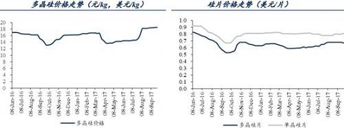 多晶硅價(jià)格維持高位,企業(yè)盈利可期。自2017年“630”以后,由于光伏行業(yè)發(fā)展遠(yuǎn)超預(yù)期,加上企業(yè)檢修、部分企業(yè)擴(kuò)產(chǎn)進(jìn)度拖后等原因,多晶硅處于供不應(yīng)求狀態(tài),多晶硅價(jià)格連續(xù)上漲并保持高位。