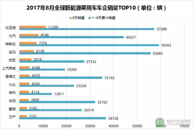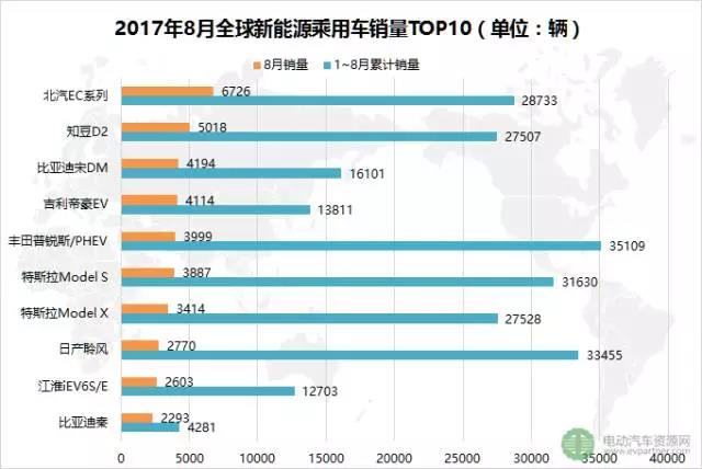 從上圖我們可以發(fā)現(xiàn),2017年8月全球新能源乘用車車企銷量排行中,前兩位均為自主品牌,在TOP10中,自主品牌就占有5席,整體來說,算不錯(cuò)的成績(jī)。