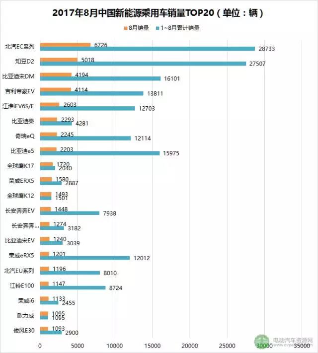 2017年8月中國新能源乘用車銷量排行中,北汽EC系列奪得了冠軍,8月銷售6726臺(tái);知豆D2銷售了5018臺(tái),排在第二位;排在第三的是比亞迪宋DM,8月銷售4194臺(tái)。