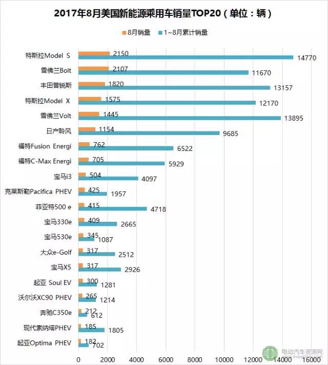 2017年8月美國新能源乘用車銷量排行中,特斯拉Model S奪得了冠軍,8月交付2150臺(tái);雪佛蘭Bolt銷售了2107臺(tái),排在第二位;排在第三的是豐田普銳斯,8月銷售1820臺(tái)。