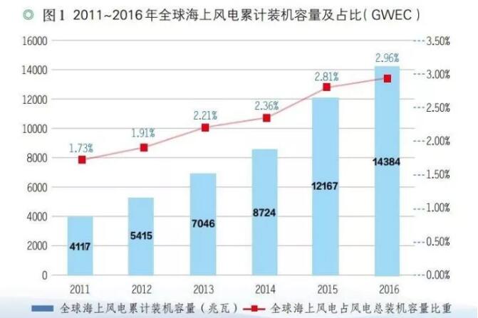 根據(jù)全球風(fēng)能協(xié)會(GWEC)年度風(fēng)電統(tǒng)計數(shù)據(jù),截至2016年底,全球已建成海上風(fēng)電累計裝機容量14384兆瓦,其中2016年新增裝機容量2219兆瓦,同比增長18.2%。全球海上風(fēng)電占風(fēng)電總裝機容量的比重由2011年的1.73%上升至2016年的2.96%,2011~2016年全球海上風(fēng)電累計裝機容量及占比如圖1所示。