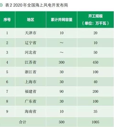 根據(jù)《風(fēng)電發(fā)展“十三五”規(guī)劃》,“十三五”期間將積極穩(wěn)妥推進海上風(fēng)電建設(shè),重點推動江蘇、浙江、福建、廣東等省的海上風(fēng)電建設(shè),到2020年四省海上風(fēng)電開工建設(shè)規(guī)模均達到百萬千瓦以上;積極推動天津、河北、上海、海南等省(市)的海上風(fēng)電建設(shè);探索性推進遼寧、山東、廣西等省(區(qū))的海上風(fēng)電項目。到2020年,全國海上風(fēng)電開工建設(shè)規(guī)模達到1000萬千瓦,力爭累計并網(wǎng)容量達到500萬千瓦以上。詳細情況見表2。