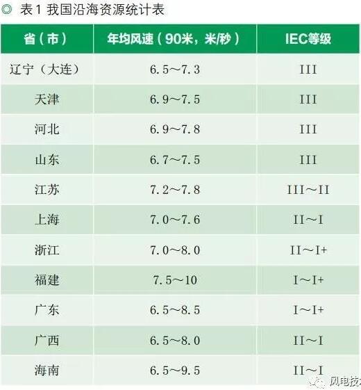 臺灣海峽年平均風(fēng)速基本在7.5~10米/秒之間,局部區(qū)域年平均風(fēng)速可達10米/秒以上。該區(qū)域也是我國受臺風(fēng)侵襲最多的地區(qū)之一,風(fēng)電場以IECⅠ或Ⅰ+類為主。從臺灣海峽向南的廣東、廣西海域,90米高度年平均風(fēng)速逐漸降至6.5~8.5米/秒之間,風(fēng)電場大多屬于IEC 或Ⅱ類。從臺灣海峽向北的浙江、上海、江蘇海域,90米高度年平均風(fēng)速逐漸降至7~8米/秒之間,浙江和上海海域風(fēng)電場大多屬于IEC Ⅱ至Ⅰ+類,江蘇海域風(fēng)電場大多屬于IEC Ⅲ或Ⅱ類。位于環(huán)渤海和黃海北部的遼寧、河北海域90米高度年平均風(fēng)速基本在6.5~8米/秒之間,該海域風(fēng)電場大多屬于IEC Ⅲ類。我國沿海各省風(fēng)資源統(tǒng)計見表 1。