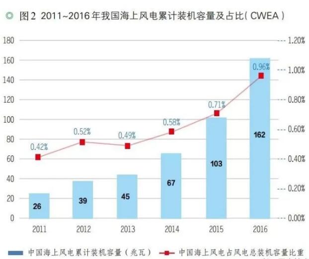 根據(jù)中國可再生能源學(xué)會風(fēng)能專業(yè)委員會(CWEA)數(shù)據(jù),截至2016年底,我國已建成海上風(fēng)電累計裝機容量162萬千瓦。2009年,東海大橋海上示范風(fēng)電場率先建成投產(chǎn),之后的3年里,江蘇如東30兆瓦和150兆瓦潮間帶試驗、示范風(fēng)電場及其擴建工程將陸續(xù)開工建成。2012年底我國海上風(fēng)電場累計裝機接近40萬千瓦;受海域使用推進緩慢等因素影響,2013 年海上風(fēng)電發(fā)展明顯放緩;2014年,我國海上風(fēng)電新增并網(wǎng)容量約20萬千瓦,全部位于江蘇省;2015年我國海上風(fēng)電新增裝機容量為36萬千瓦,主要分布在江蘇省和福建省。2016 年中國海上風(fēng)電新增裝機154臺,容量達到59萬千瓦,同比增長64%。我國海上風(fēng)電占全國風(fēng)電總裝機容量的比重由2011年的0.42%上升至2016年的0.96%。2011~2016年我國海上風(fēng)電累計裝機容量及占比如圖2所示。