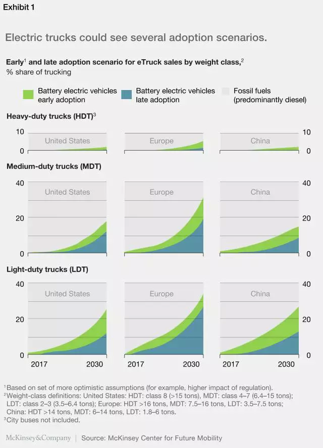 麥肯錫的模型集中在兩大類可能出現(xiàn)的場(chǎng)景(two scenarios)——早期采用(early adoption)和晚期采用(late adoption),來(lái)幫助在不同重量類別和地區(qū)中設(shè)置新的分析維度(如圖 1 所示)。這兩類場(chǎng)景反映了對(duì)于核心假設(shè)的不同觀點(diǎn),例如:監(jiān)管方面能否有效推動(dòng)?基礎(chǔ)設(shè)施方面何時(shí)能夠準(zhǔn)備好?供應(yīng)鏈方面能否保證?各相關(guān)方對(duì)這些問(wèn)題的不同解決力度將決定電動(dòng)卡車最終大規(guī)模普及的時(shí)間。