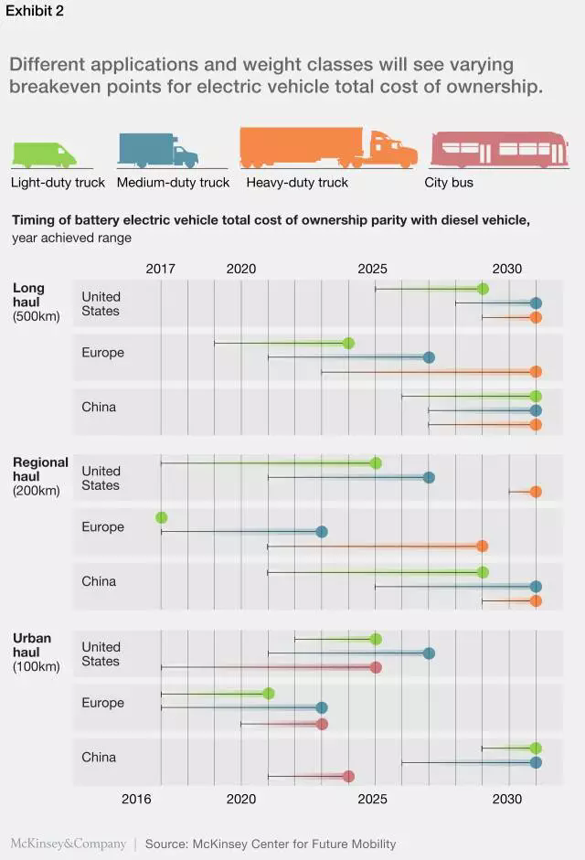 在重型商用車中,城市公共汽車將最早實(shí)現(xiàn)收支平衡。如圖 2 所示,實(shí)現(xiàn)的時(shí)間平均處于 2023 年 ~ 2025 年之間。2016 年,由于監(jiān)管方面的考慮,中國(guó)新電動(dòng)公共汽車的銷售份額已經(jīng)超過(guò) 30%。到 2030 年,如果市政當(dāng)局制定有利的政策,電動(dòng)公共汽車的銷售份額可以達(dá)到 50% 的水平。相應(yīng)地,在歐洲和美國(guó)地區(qū)的純電動(dòng)商用車中,城市公共汽車也將實(shí)現(xiàn)最高的市場(chǎng)滲透率。