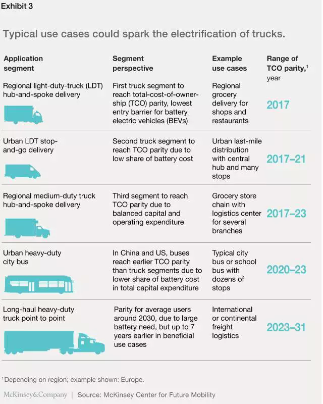 基于對(duì)多種可能出現(xiàn)的場(chǎng)景(scenarios)的分析,麥肯錫的研究表明,在不同的細(xì)分市場(chǎng)中,商用車電動(dòng)化進(jìn)程將以不同的速度推進(jìn),視使用案例(use cases)的具體特點(diǎn)而定。
