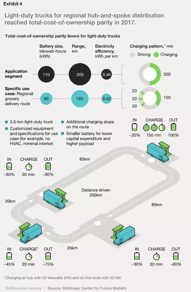 在這一使用案例中,電動(dòng)卡車現(xiàn)在就能夠與柴油卡車的總擁有成本(TCO) 持平。雖然大多數(shù)行業(yè)參與者都專注于最后一英里和城市內(nèi)部貨運(yùn)的解決方案,但從 TCO 的角度來(lái)看,地區(qū)性中心輻射型的配送方式更有利,其潛在客戶包括需要地區(qū)食品配送服務(wù)的商店和餐館。