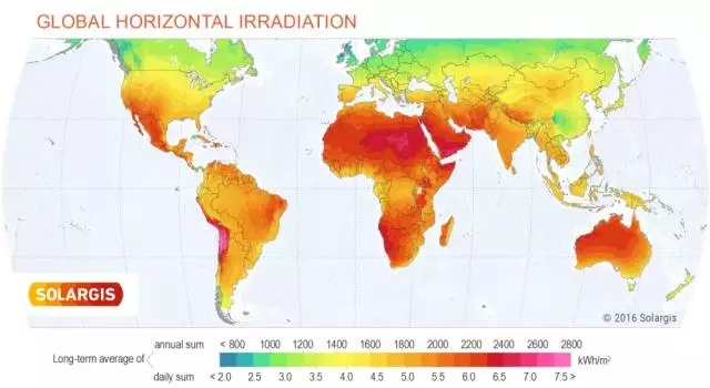 中東地區(qū)地廣人稀但光照充足,為特大型光伏電站創(chuàng)造了有利條件。沙特阿拉伯地區(qū)的年均光照強(qiáng)度為2200~2400 kWh/m2(中國(guó)大部分地區(qū)在1400~1600 kWh/m2)。阿布扎比擁有目前全球最大的單體光伏電站“阿布扎比之光”,其總裝機(jī)容量達(dá)1177MW。規(guī)模效應(yīng)使得項(xiàng)目的度電成本下降也是中東地區(qū)光伏電價(jià)低的原因之一。