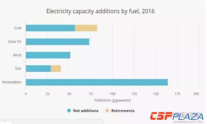 中國(guó)儲(chǔ)能網(wǎng)訊:國(guó)際能源署發(fā)布2017年可再生能源報(bào)告,確認(rèn)2016年全球新增可再生能源裝機(jī)165吉瓦,其中太陽(yáng)能光伏裝機(jī)達(dá)到74吉瓦(約46%來(lái)自中國(guó)),首次超過(guò)煤電新增裝機(jī)(57吉瓦)。