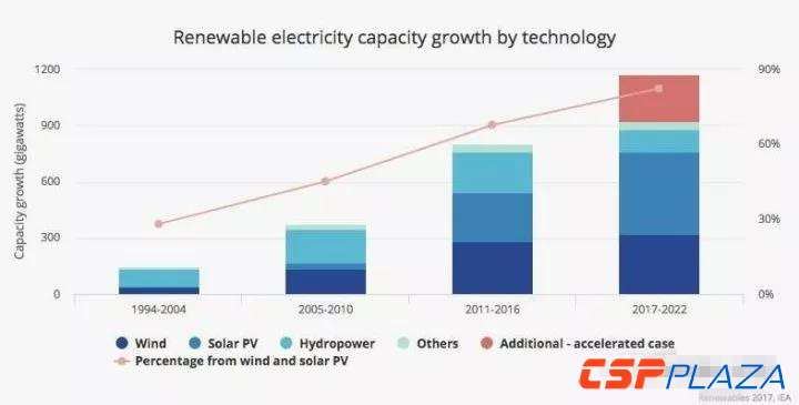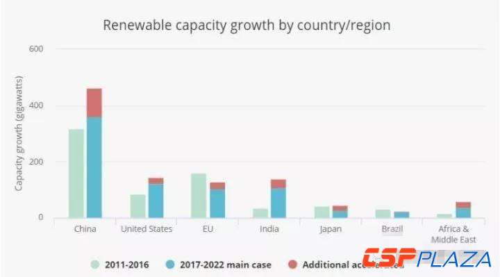 過(guò)去對(duì)于可再生能源發(fā)展規(guī)模預(yù)測(cè)曾經(jīng)偏保守的IEA現(xiàn)在預(yù)測(cè),2017-2022年間全球可再生能源新增裝機(jī)將至少達(dá)到920吉瓦(其中風(fēng)電321吉瓦、光伏438吉瓦),其中363吉瓦(39%)將來(lái)自中國(guó)。如果各國(guó)政策支持力度加大的樂(lè)觀情形下,2017-2022年間可再生能源新增裝機(jī)可能達(dá)到1150吉瓦,其中464吉瓦(40%)來(lái)自中國(guó)。