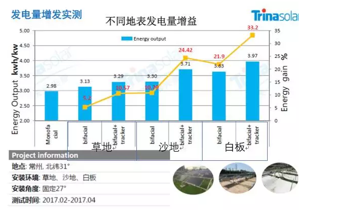 天合光能的雙面組件在17年2~4月在草地、沙地和白板的地面反射條件下相對常規(guī)組件可分別多發(fā)電5.2%、10.79%、21.9%;配合跟蹤支架則多發(fā)電結(jié)果變?yōu)?0.57%、24.42%、33.2%。發(fā)現(xiàn)雙面PERC組件配合跟蹤支架可實現(xiàn)1+12的效果。