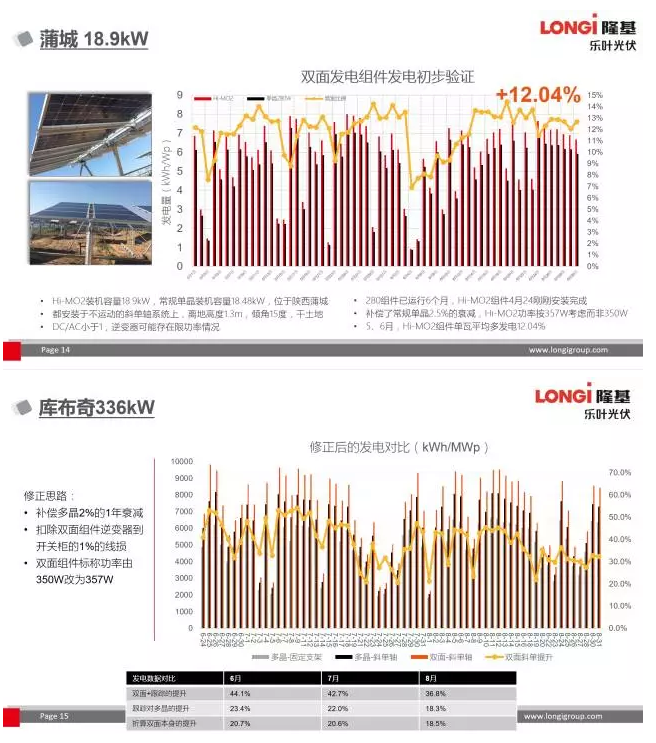 隆基樂葉在草和土的混合地面條件下,在組件安裝高度1.3米時,在17年5~6月雙面PERC組件相對常規(guī)單晶多發(fā)電比例為12%。而在庫布奇336kW的客戶項目中,雙面組件配合跟蹤支架在6~8月實現(xiàn)了40%左右的發(fā)電量提升(相對常規(guī)多晶)。