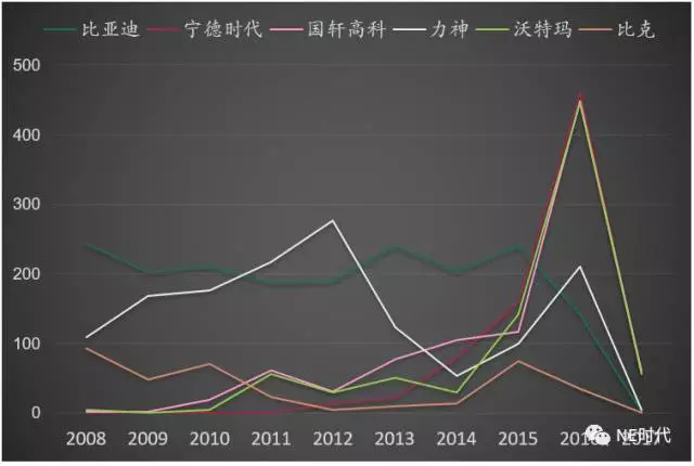 天津力神在2012年之前在專利申報方面一直處于領(lǐng)先地位,但是2012年后進入快速下降同道。直到2016年贏來了一個小高峰,可能是加大了汽車電池的研發(fā)投入。