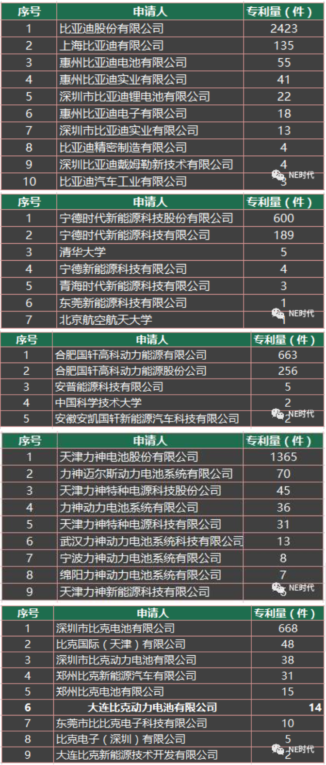 從數(shù)據(jù)對比可以看出,比亞迪作為國內(nèi)電池行業(yè)的領(lǐng)導者,前幾年專利申報一直保持在高位,遠遠領(lǐng)先其他幾家企業(yè)。但近兩年,電池相關(guān)的專利申報數(shù)量大幅下滑,這說明比亞迪公司內(nèi)部戰(zhàn)略可能發(fā)生了變化,動力電池領(lǐng)域技術(shù)投入力度不大。