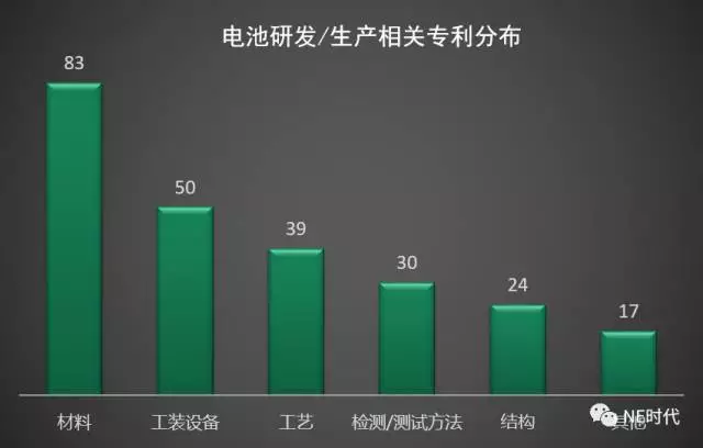 跟電池研發(fā)、生產(chǎn)相關(guān)的發(fā)明專利中,又可以分成材料、工藝、結(jié)構(gòu)、工裝設(shè)備、檢測方法等幾大類,其中材料專利的數(shù)量最多,這與筆者當初猜測有大量材料相關(guān)的專利是吻合的。