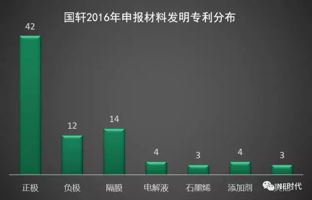 筆者對所有的材料發(fā)明專利進行了分析和分類,發(fā)現(xiàn)其中正極材料的專利最多,有42篇。其次是隔膜專利,共14篇。負極材料相關(guān)專利12篇。而電解液只有4篇。另外還有少量的溶劑、導電劑、集流體、石墨烯等專利。從中我們可以發(fā)現(xiàn),國軒在材料的自主研發(fā)方面主要布局在正極、負極和隔膜。