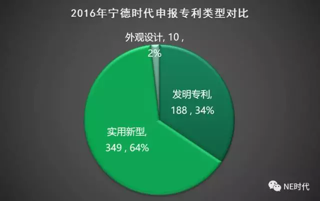通過檢索2016年寧德時代申請的所有專利,發(fā)現(xiàn)中國申請專利553件,同時還有國際申請專利6件。而在國內(nèi)申請的專利中,發(fā)明專利188件,實用新型專利349件,外觀專利10件,這與上一期中國軒高科發(fā)明專利和外觀設(shè)計專利偏多的情況有很大的不一樣。
