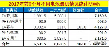 從不同類型電池來看,在2017年前9個月14.75GWh的鋰離子電池總裝機(jī)量中,三元/錳系電池以8.04GWh占比54.49%,其中錳酸鋰電池不到0.7GWh;磷酸鐵鋰電池以6.53GWh占比44.27%。
