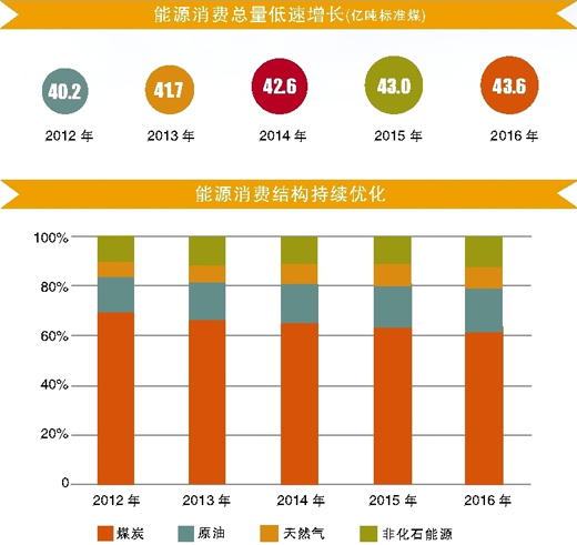 五年回首,能源生產(chǎn)轉(zhuǎn)型升級,消費革命生生不息。2016年,全國能源消費總量為43.6億噸標(biāo)準(zhǔn)煤,其中,煤炭消費比2012年下降6.5個百分點;清潔能源消費(含天然氣)比重達到19.7%,比2012年提高5.2個百分點。電源和電網(wǎng)建設(shè)蹄疾步穩(wěn)、煤電超低排放改造啟動實施、非化石能源投資與日俱增、天然氣供應(yīng)不斷擴大……高能效、低污染的清潔能源消費比重節(jié)節(jié)攀升,能源消費品種結(jié)構(gòu)持續(xù)優(yōu)化。