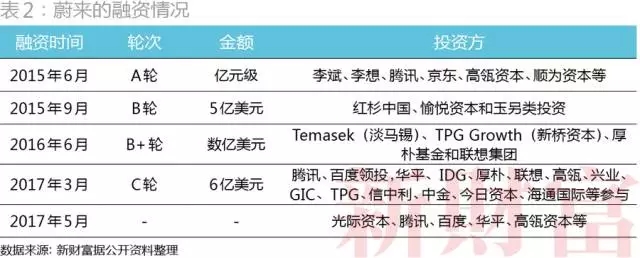在這其中,不僅BAT三巨頭中的騰訊與百度不約而同地相中了蔚來汽車,京東劉強(qiáng)東、小米雷軍、汽車之家創(chuàng)始人李想、順為資本、高瓴資本、紅杉資本、聯(lián)想集團(tuán)等紛紛為其投入了真金白銀。2017年C輪融資過后,蔚來的估值已達(dá)200億元(表2)。