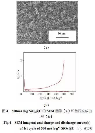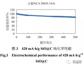 在氧化亞硅碳復(fù)合材料方面,已經(jīng)有較為成熟的軟碳包覆工藝,在固相條件下對原材料表面進行高溫?zé)崽幚恚梢杂行岣卟牧鲜仔?、增加?dǎo)電性、緩解膨脹。目前,項目組已經(jīng)可以制備批次穩(wěn)定性較高的碳包覆氧化亞硅材料,并且在合作單位取得了較好的測試結(jié)果反饋。如420 mA·h/g 的碳包覆氧 化亞硅材料,匹配正極鋰鎳錳酸鋁(NCA),制備成3A·h規(guī)格為20650的鋼殼電池,在1C充電、 10C放電的測試條件下,循環(huán)500 周容量保持80% (圖3)。