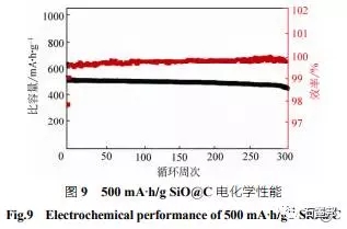 在氧化亞硅碳復(fù)合材料方面,項目組主要通過控制氧含量以及與第二相復(fù)合對氧化亞硅的電化學(xué)性能進行優(yōu)化。其中,對氧化亞硅中硅晶粒的調(diào)控取得了進展并在表面電荷作用下制備出表界面穩(wěn)定的高容量氧化亞硅碳負極材料,有效地提高了氧化亞硅的首次及后續(xù)庫侖效率,改善了其循環(huán)穩(wěn)定性。為進一步改善電極材料的高壓實條件下的性能,項目組采用包覆工藝,并通過對材料復(fù)合過程的控制,也取得了較大進展。比容量500 mA·h/g 在1C充放條件下其電化學(xué)性能如圖9所示。石墨邦 www.shimobang.cn —國內(nèi)首家碳石墨電商平臺