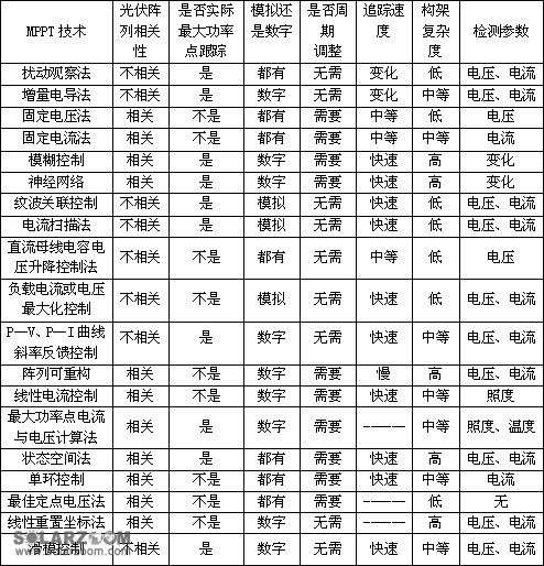 在光伏發(fā)電系統(tǒng)的效率計(jì)算中光伏轉(zhuǎn)換效率比重很大,如果不妥善解決,會導(dǎo)致整體效率下降轉(zhuǎn)換效率決定于轉(zhuǎn)換系統(tǒng)的工作點(diǎn),最大功率點(diǎn)跟蹤(MPPT)控制能夠使工作點(diǎn)處于最優(yōu)位置,改善轉(zhuǎn)換效率,減少發(fā)電成本,是目前應(yīng)用比較成熟的技術(shù)。一個(gè)比較好的MPPT控制要做到5點(diǎn):快速、高效、獨(dú)立、準(zhǔn)確、低價(jià)。這些特點(diǎn)可以用來對當(dāng)前使用的MPPT的幾種算法進(jìn)行評價(jià),如下表所示。