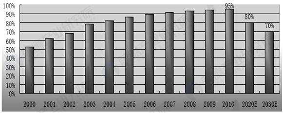 2000-2030年全球并網(wǎng)系統(tǒng)占總安裝量比例及預(yù)測(cè)(單位:%)