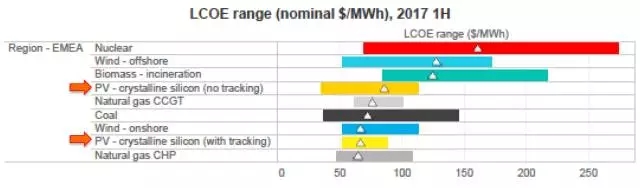 2016 和2017 年光伏的價(jià)格已經(jīng)低于天然氣和煤炭。下圖為全球范圍內(nèi),各種能源的度電成本(LCOE)范圍。從圖中可以看出,固定式光伏的LCOE低于風(fēng)電、生物質(zhì)能等其他新能源;跟蹤式光伏系統(tǒng)的LCOE甚至低于天然氣、煤電的水平。