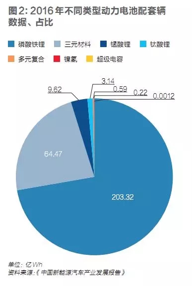 國(guó)內(nèi)的動(dòng)力電池以磷酸鐵鋰電池和三元電池為主,其中磷酸鐵鋰主要供應(yīng)客車(chē),三元電池主要供應(yīng)中高端乘用車(chē)。新能源客車(chē)此前引領(lǐng)了國(guó)內(nèi)新能源汽車(chē)的發(fā)展,因此,鐵鋰電池是當(dāng)前國(guó)內(nèi)電池產(chǎn)能的主力。中國(guó)汽車(chē)技術(shù)研究中心的數(shù)據(jù)顯示,2016年中國(guó)生產(chǎn)的新能源汽車(chē)中,磷酸鐵鋰電池總配套量為203.32億Wh,占比72.26%,其中的72%供應(yīng)給純電動(dòng)客車(chē);三元電池總配套量為64.47億Wh,占比22.91%,其中的73%供應(yīng)給純電動(dòng)乘用車(chē)。
