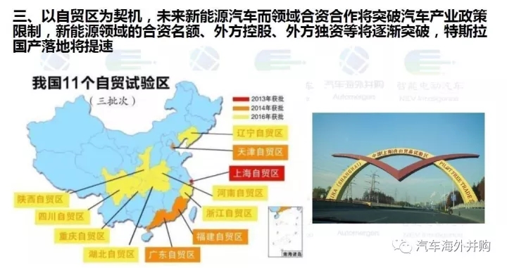2017年6月16日2017版《自由貿(mào)易試驗(yàn)區(qū)外商投資準(zhǔn)入特別管理措施(負(fù)面清單)(2017年版)》發(fā)布, 新版負(fù)面清單與上一版(2015版)相比,取消了“新建純電動(dòng)乘用車(chē)生產(chǎn)企業(yè)生產(chǎn)的產(chǎn)品須使用自有品牌,擁有自主知識(shí)產(chǎn)權(quán)和已授權(quán)的相關(guān)發(fā)明專(zhuān)利?!边@為特斯拉在自貿(mào)區(qū)國(guó)產(chǎn)落地打開(kāi)了一扇窗。