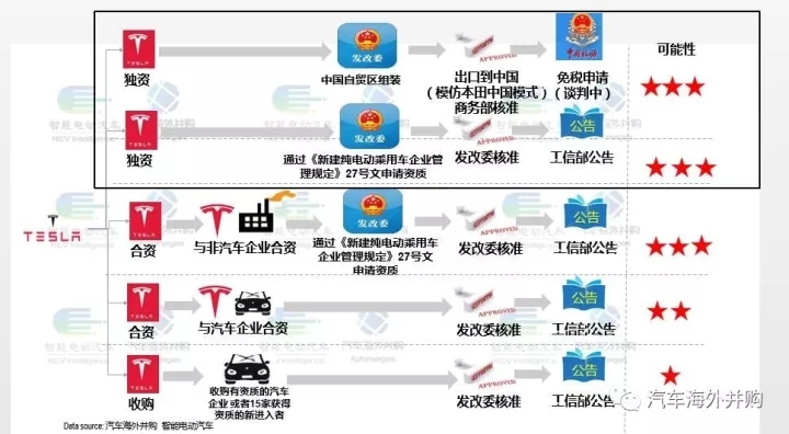 第五種,收購(gòu)現(xiàn)有中國(guó)汽車(chē)企業(yè)或收購(gòu)15家已獲得新能源生產(chǎn)資質(zhì)的新進(jìn)入者。